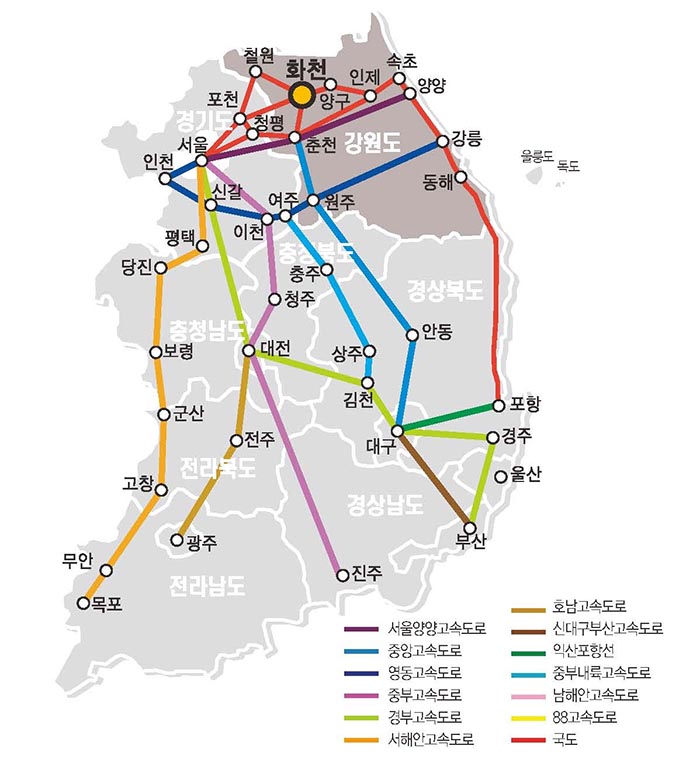 3. 춘천을 지나 화천 방향 표지판을 따라 직진하면 화천에 도착합니다.